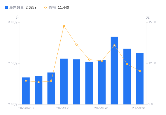 近一年(2024年12月20日至2025年12月10日),云南能投A股股东户数从2.32万户,增加至2.63万户,增幅13.09%,区间股价下跌3.70%。