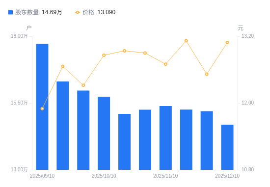 近一年(2024年12月10日至2025年12月10日),东方雨虹A股股东户数从19.82万户,减低至14.69万户,降幅25.86%,区间股价上涨11.21%。