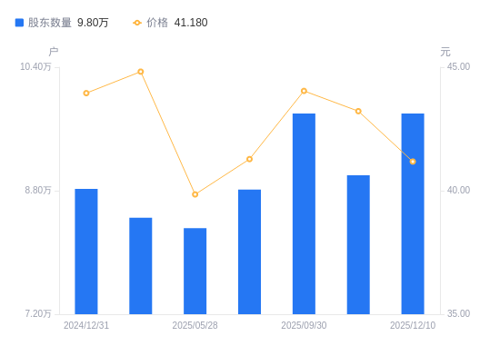 近一年(2024年12月31日至2025年12月10日),通策医疗A股股东户数从8.82万户,增加至9.8万户,增幅11.05%,区间股价下跌9.22%。