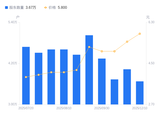 近一年(2024年12月31日至2025年12月10日),金新农A股股东户数从4.63万户,减低至3.67万户,降幅20.57%,区间股价上涨44.28%。