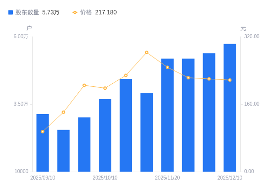 12月16日消息,数据显示,截至2025年12月10日,德明利A股股东总户数为5.73万户,较上期(2025年11月28日)增加3444户,增幅6.39%。公司最新A股总股本为2.27亿股,其中流通A股1.61亿股,户均持有流通A股数量为2805.7股,较上期减少179.29股,降幅6.01%;户均持流通A股市值60.93万元,较上期减少4.71万元,降幅7.17%。