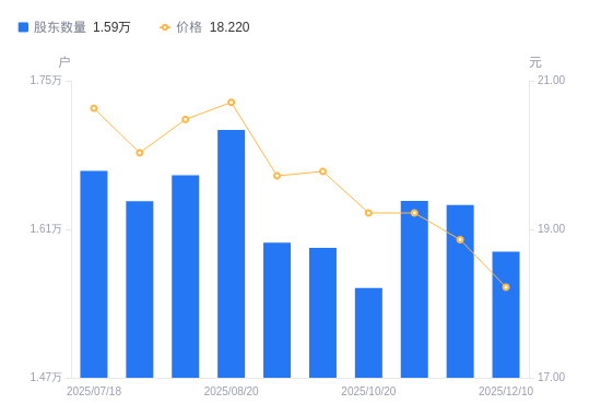 近一年(2024年12月20日至2025年12月10日),迦南智能A股股东户数从1.96万户,减低至1.59万户,降幅18.98%,区间股价下跌20.75%。