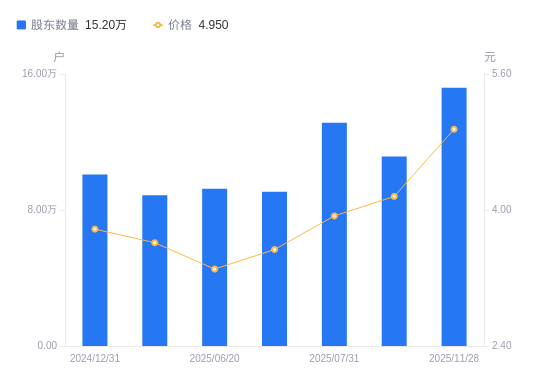 近一年(2024年12月31日至2025年11月28日),海南机场A股股东户数从10.08万户,增加至15.2万户,增幅50.73%,区间股价上涨29.75%。