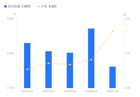 近一年(2024年12月31日至2025年11月28日),陕鼓动力A股股东户数从3.09万户,减低至2.89万户,降幅6.65%,区间股价上涨4.63%。