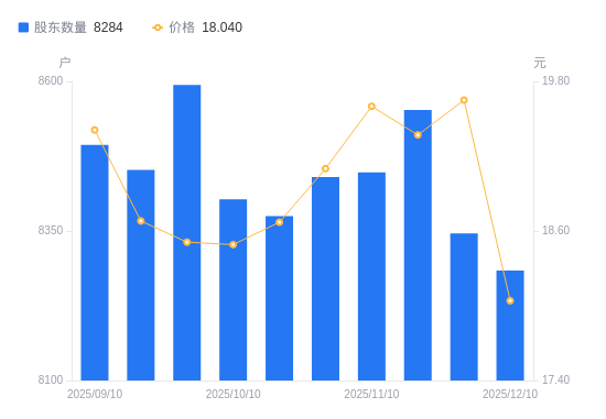 近一年(2024年11月20日至2025年11月20日),深圳瑞捷A股股东户数从1.34万户,减低至8552户,降幅36.09%,区间股价下跌14.29%。