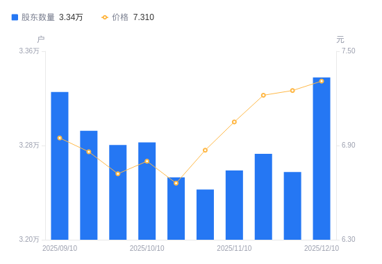 近一年(2024年12月20日至2025年12月10日),尤洛卡A股股东户数从3.49万户,减低至3.34万户,降幅4.27%,区间股价上涨13.49%。