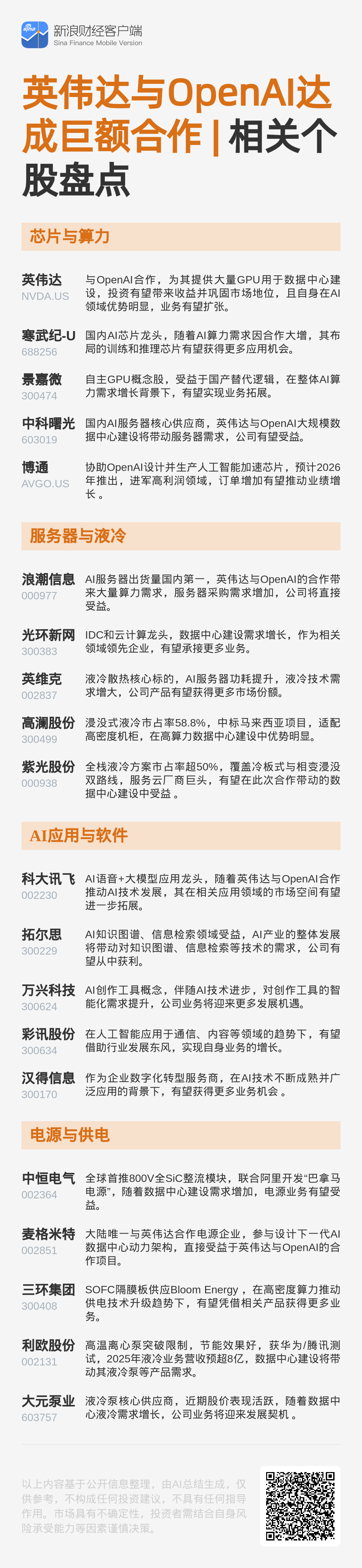 英伟达计划最高投资1000亿美元,随每1GW系统部署逐步到位,首个1GW系统2026年下半年上线。消息公布后,英伟达股价收涨逾3.9%创收盘历史新高。