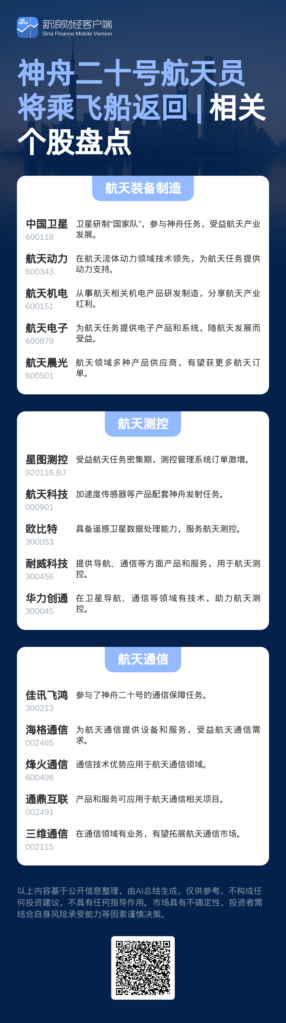 11月14日新华社消息,中国载人航天工程办公室称,神舟二十号航天员乘组将于11月14日乘神舟二十一号飞船返回东风着陆场。