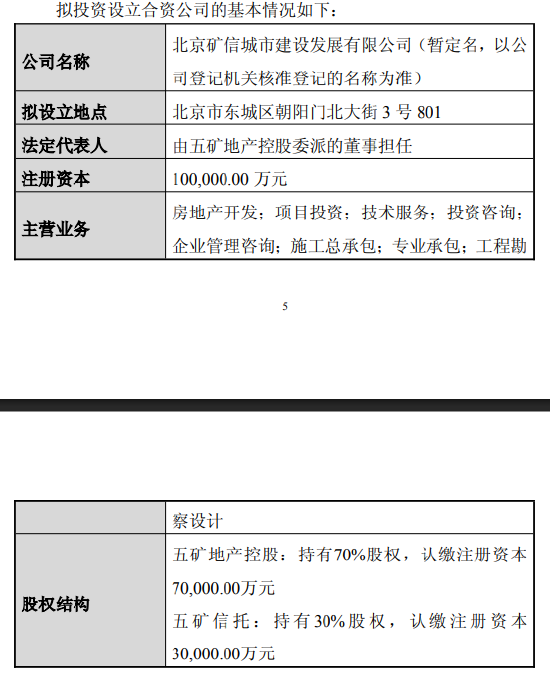 根据公告,本次拟投资设立的合资公司暂定名为“北京矿信城市建设发展有限公司”,注册资本10亿元,注册地为北京市东城区。股权结构方面,五矿地产控股认缴7亿元,持有70%股权;五矿信托认缴3亿元,持有30%股权。