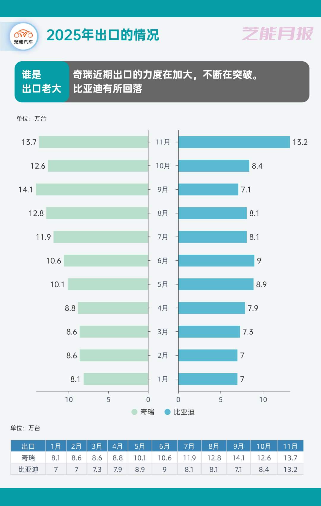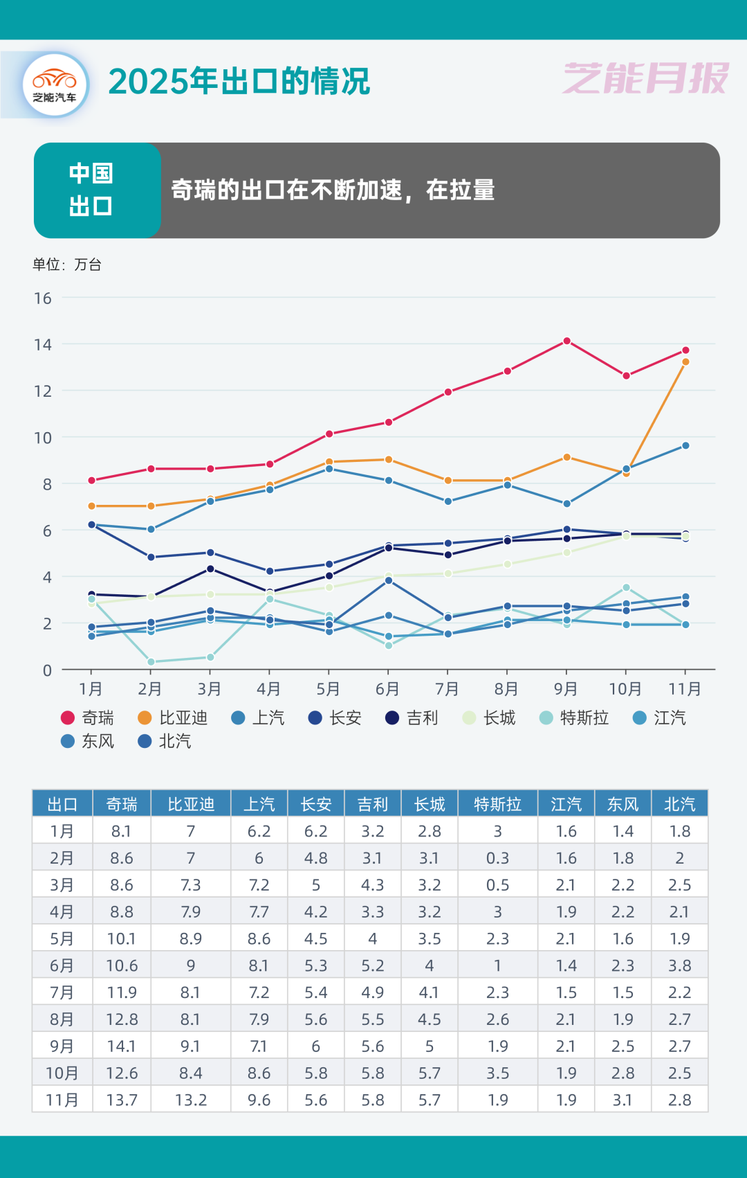 比亚迪是本月最大亮点,出口体量首次逼近奇瑞,同比增幅高达 3 倍以上。