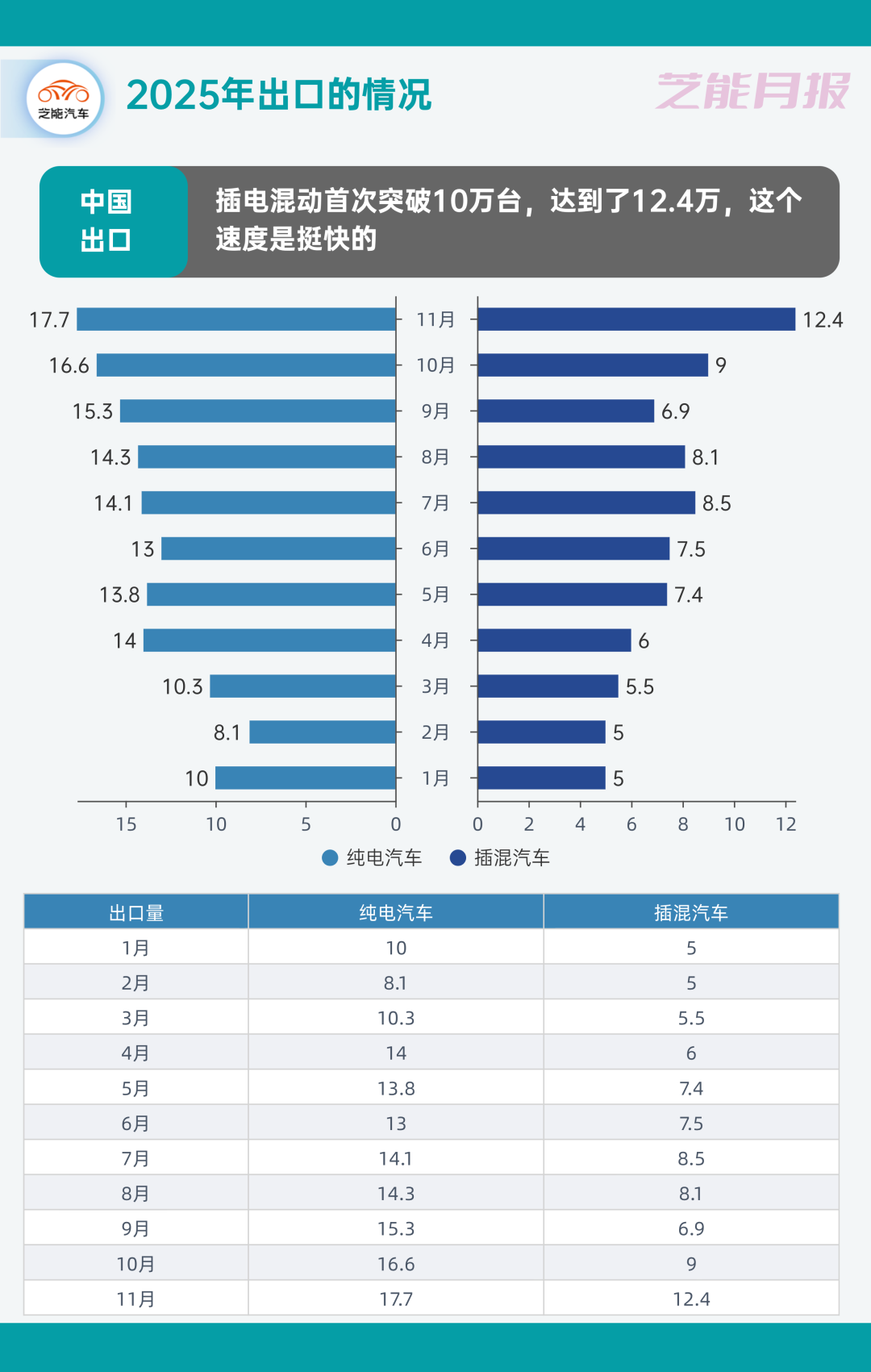 ◎插混(PHEV):11月 12.4 万辆,同比增长 4 倍。