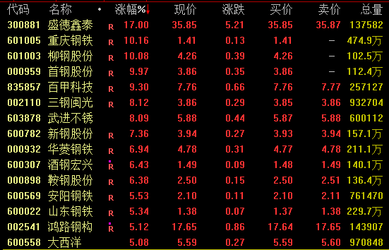 钢铁板块午后大幅拉升,截至收盘,盛德鑫泰涨17%,盘中一度触及20%涨停;重庆钢铁、柳钢股份、首钢股份等均涨停,三钢闽光、武进不锈涨逾8%。