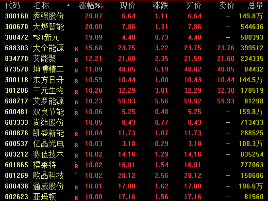 光伏产业链股盘中发力上扬,截至收盘,秀强股份、大烨智能20%涨停,大全能源涨超15%,福莱特、通威股份、亚玛顿等均涨停。