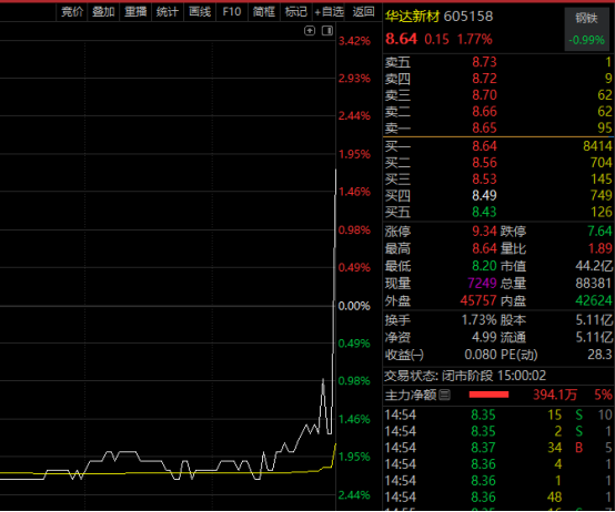 今天(7月15日),华达新材(605158)尾盘大幅异动,集合竞价从8.35元/股直线飙升至8.64元/股,涨幅超过3%。资料显示,公司是国内较早进入热镀锌铝板和彩色涂层板行业的民营企业之一,现已发展成为产业链布局完整、产品质量良好的热镀锌铝板和彩色涂层板生产企业,主营镀锌钢带、冷轧钢板、工业用氢化亚铁等建材的制造和销售。