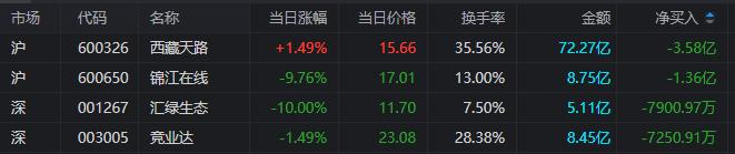 龙虎榜单日净卖出额前三为西藏天路、锦江在线、汇绿生态,分别为3.58亿元、1.36亿元、7900.97万元。