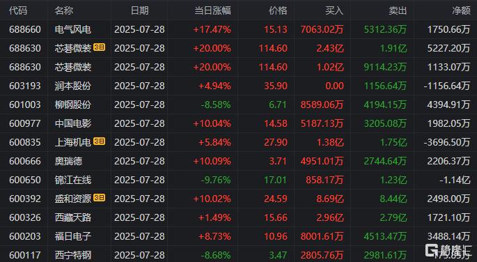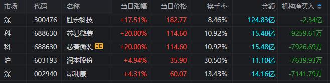 龙虎榜中涉及机构专用席位的个股中,当日净卖出额前三为胜宏科技、芯碁微装、润本股份,分别为2.34亿元、9259.61万元、7639.93万元。