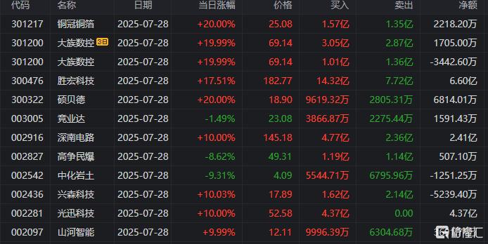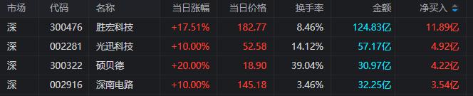 龙虎榜单日净买入额前三为胜宏科技、光迅科技、硕贝德,分别为11.89亿元、4.92亿元、4.22亿元。