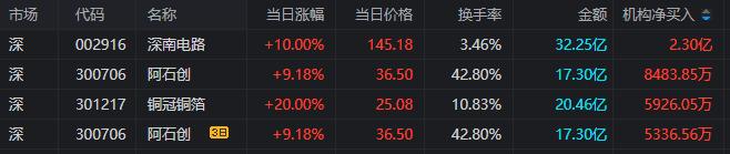龙虎榜中涉及机构专用席位的个股中,当日净买入额前三为深南电路、阿石创、铜冠铜箔,分别为2.30亿元、8483.85万元、5926.05万元。