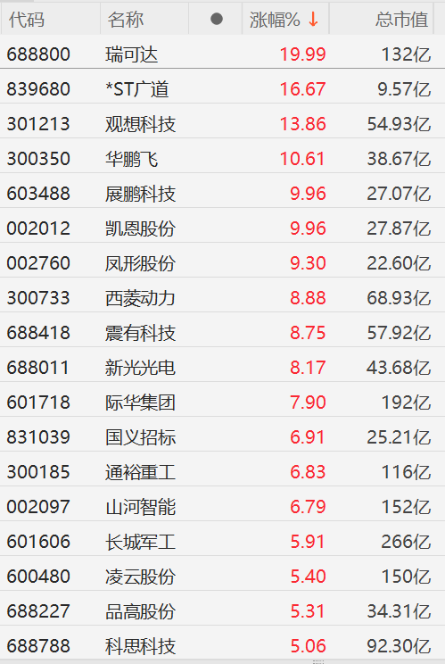 格隆汇8月1日|A股市场军工股盘中拉升,其中,瑞可达20CM涨停,观想科技涨超13%,华鹏飞(维权)涨超10%,展鹏科技、凯恩股份10CM涨停,凤形股份(维权)逼近涨停,西菱动力(维权)、震有科技、新光光电涨超8%,际华集团涨超7%,国义招标、通裕重工、山河智能涨超6%,长城军工、凌云股份、品高股份、科思科技涨超5%。