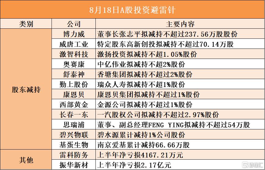 博力威董事长张志平拟减持不超过237.56万股股份;威唐工业特定股东高新创投拟减持不超过70.14万股;激智科技的激扬投资拟减持不超1.05%股份;奥赛康股东中亿伟业拟减持不超2%股份;舒泰神股东香塘集团拟减持不超过2%股份;勤上股份股东瑞众人寿拟减持不超1%股份;长春一东股东一汽股权公司拟减持不超过2.97%股份;雷科防务上半年净亏损4167.21万元;振华新材上半年净亏损2.17亿元