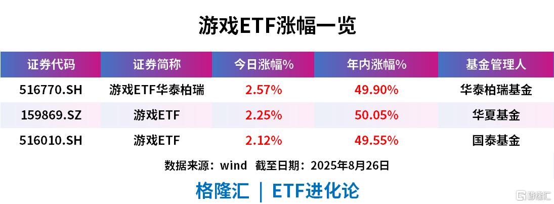 游戏ETF华泰柏瑞、游戏ETF涨超2%,年内涨幅50%。