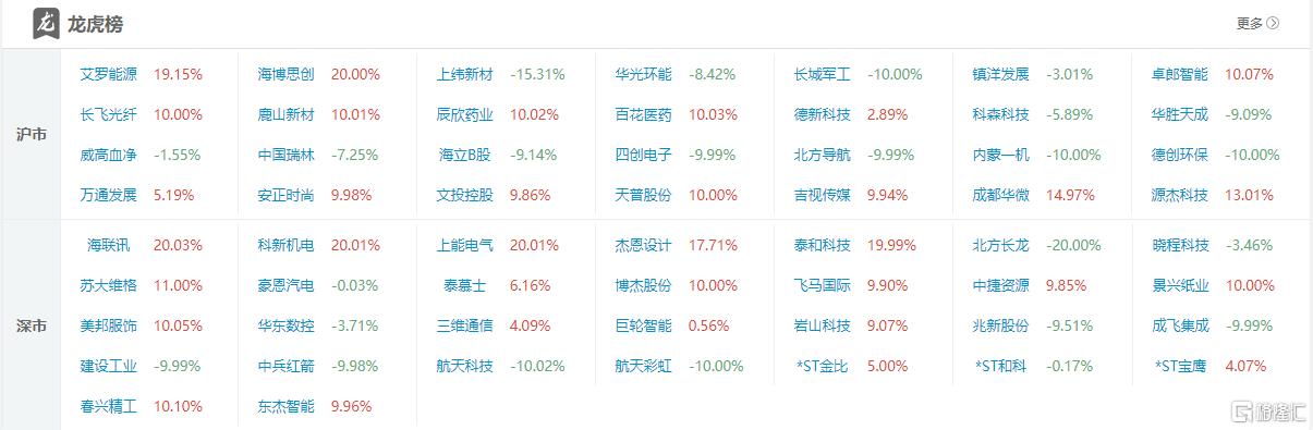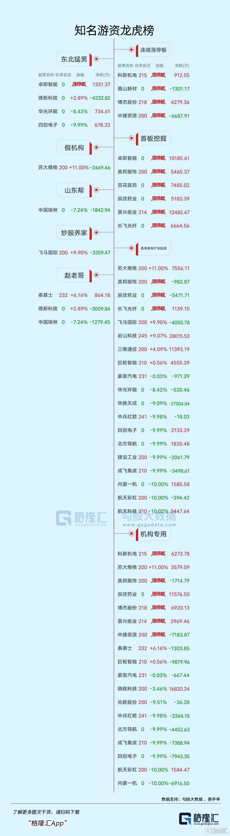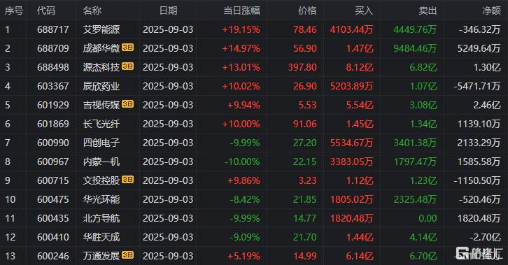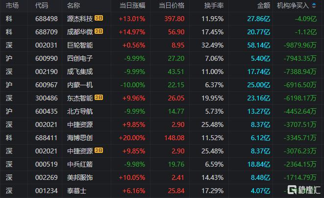 龙虎榜中涉及机构专用席位的个股中,当日净卖出额前三为巨轮智能、四创电子、成飞集成,分别为9879.96万元、7943.35万元、7388.94万元。