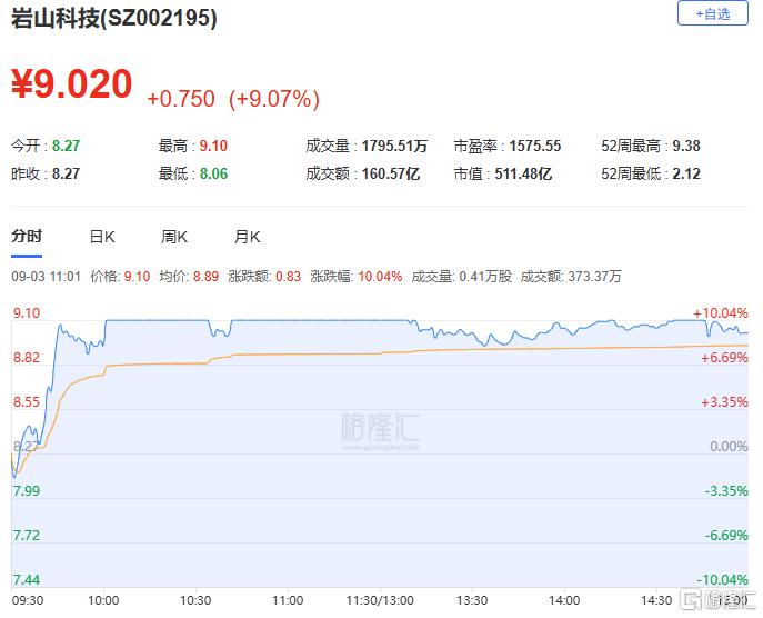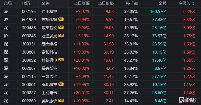 龙虎榜单日净买入额前三为岩山科技、苏大维格(维权)、泰和科技,分别为6.39亿元、1.63亿元、1.50亿元。