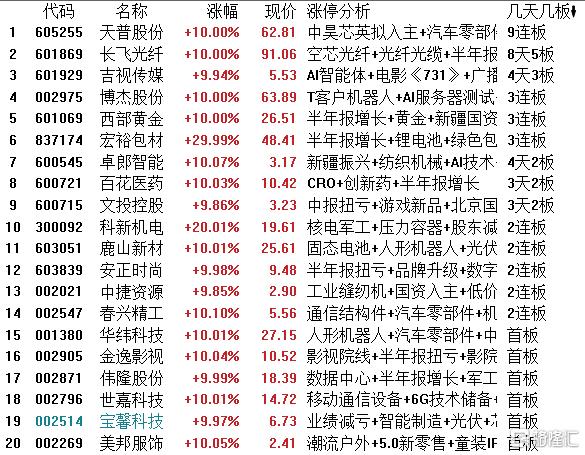 高位股方面,天普股份一字涨停晋级9连板,算力产业链的长飞光纤8天5板,吉视传媒4天3板,博杰股份、西部黄金、宏裕包材3连板,卓郎智能(维权)4天2板,百花医药(维权)3天2板。