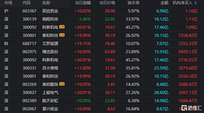 龙虎榜中涉及机构专用席位的个股中,当日净买入额前三为辰欣药业、晓程科技、博杰股份,分别为1.16亿元、1.11亿元、6920.13万元。