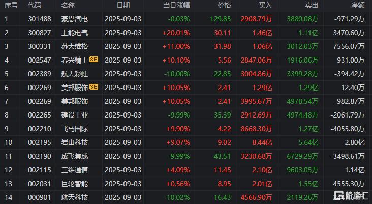 龙虎榜单日净卖出额前三为华胜天成、巨轮智能、成飞集成,分别为3.71亿元、2.68亿元、9748.69万元。