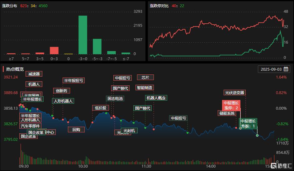 9月3日,沪深两市全天成交额2.36万亿,较上个交易日缩量5109亿。板块方面,光伏、贵金属、芬太尼、BC电池、游戏等少数板块上涨,军工装备、小金属、证券、卫星导航、软件开发等板块跌幅居前。