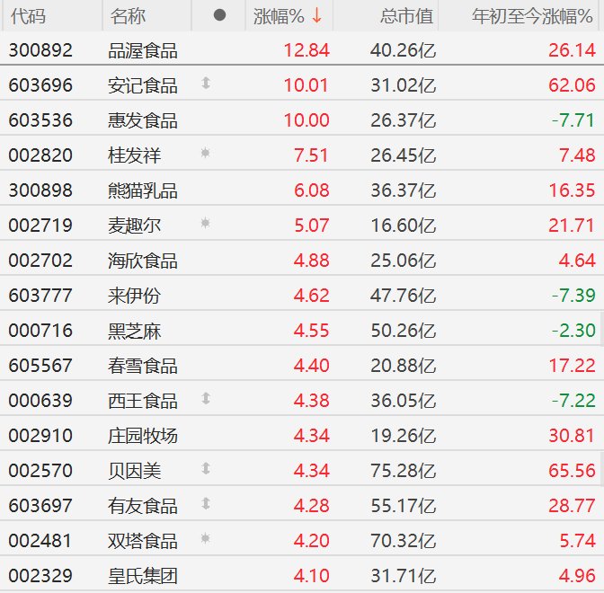 格隆汇9月4日|A股市场食品加工股逆势走强,其中,品渥食品涨近13%,安记食品、惠发食品(维权)10CM涨停,桂发祥涨超7%,熊猫乳品涨6%,麦趣尔涨5%,海欣食品、来伊份、黑芝麻、春雪食品、西王食品、有友食品、双塔食品涨超4%。