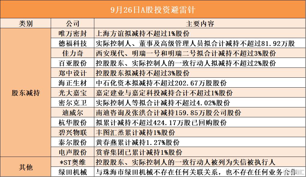 唯万密封股东上海方谊拟减持不超过1%股份;德福科技实际控制人、董事及高级管理人员拟合计减持不超过81.92万股;佳力奇股东西安现代、明瑞一号和明瑞二号拟合计减持不超过3%股份;百亚股份控股股东、实际控制人的一致行动人拟减持不超过2%股份;郑中设计控股股东拟减持不超过3%股份;海正生材股东中石化资本拟减持不超过202.67万股股份;光大嘉宝股东嘉定建业与嘉定科投减持合计不超过1%股份;密尔克卫实际控制人等拟合计减持不超过4.02%股份;*ST奥维(维权)控股股东、实际控制人的一致行动人被列为失信被执行人;绿田机械与珠海市绿田机械不存在任何关联关系,也不存在任何业务合作