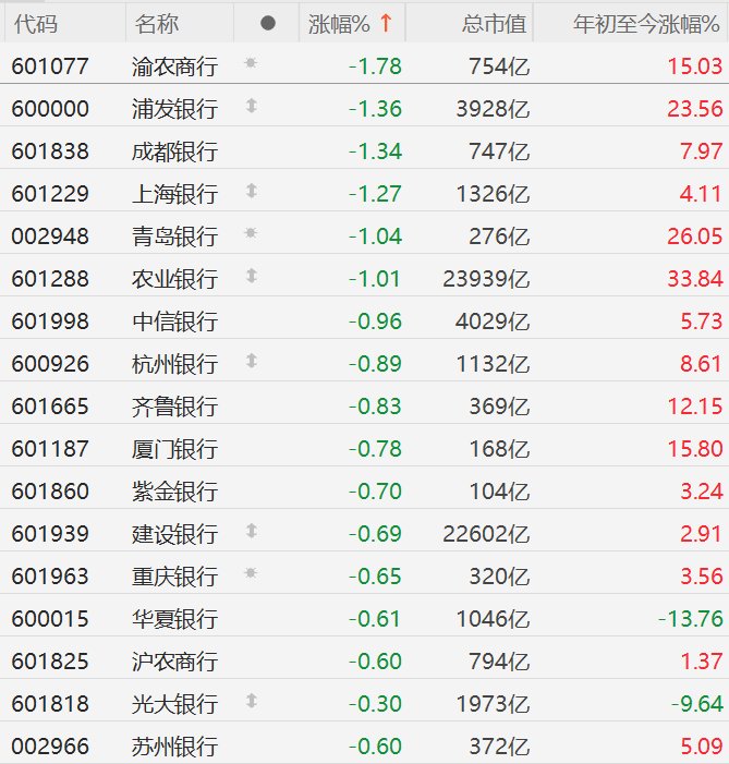 格隆汇10月14日|A股市场银行股普跌,其中,渝农商行、浦发银行、成都银行、上海银行、青岛银行、农业银行跌超1%,中信银行、杭州银行、齐鲁银行跌近1%。