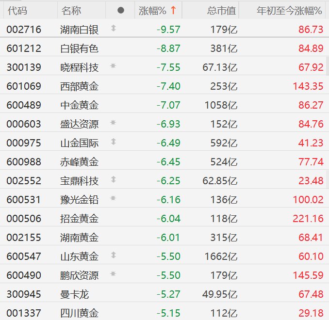 格隆汇10月22日|A股市场黄金概念股全线下挫,其中,湖南白银逼近跌停,白银有色(维权)跌超8%,晓程科技、西部黄金、中金黄金跌超7%,盛达资源、山金国际、赤峰黄金、宝鼎科技(维权)、豫光金铅、招金黄金、湖南黄金跌超6%,山东黄金、鹏欣资源、曼卡龙、四川黄金跌超5%。