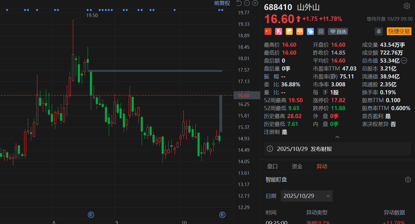 格隆汇10月29日|山外山(688410.SH)跳空高开11.78%,为A股涨幅之最,报16.6元,市值53.3亿元。