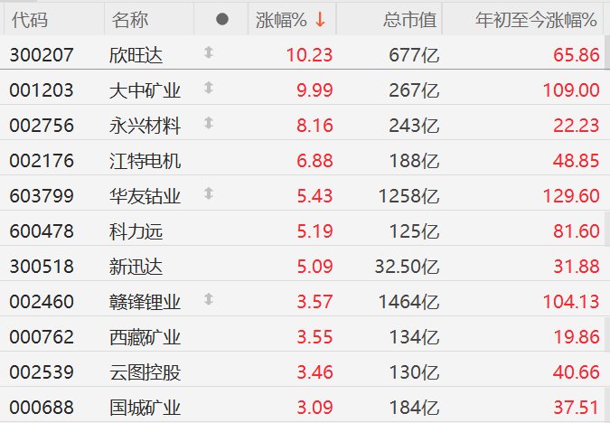 格隆汇10月30日|延续昨日涨势,A股市场锂矿股今日继续上涨,其中,欣旺达涨超10%,大中矿业10CM涨停,永兴材料涨超8%,江特电机涨超6%,华友钴业、科力远、新迅达(维权)涨超5%,赣锋锂业、西藏矿业、云图控股、国城矿业(维权)涨超3%。