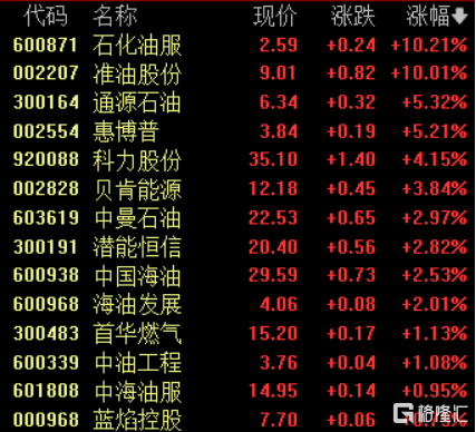 油气开采及服务板块走高,石化油服、淮油股份涨停,通源石油、惠博普涨超5%,科力股份涨超4%。
