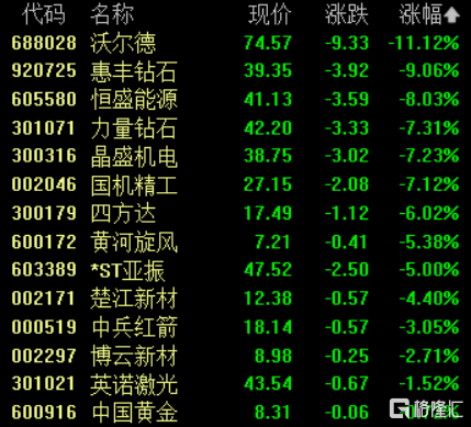 培育钻石板块转跌,沃尔德跌超11%,惠丰钻石跌超9%,恒盛能源跌超8%,力量钻石、晶盛机电跌超7%。