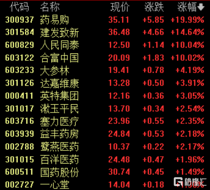 医药商业板块继续上攻,药易购涨19.9%,建发致新涨超14%,人民同泰、合富中国涨停。