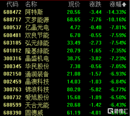 光伏设备板块回撤,阿特斯跌超14%,艾罗能源跌超10%,亿晶光电跌、弘元绿能、双良节能、隆基绿能跌超7%。
