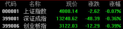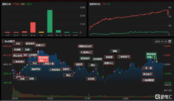 11月12日,沪指跌0.07%报4000点,深证成指跌0.36%,创业板指跌0.39%。全市场成交额1.96万亿元,较前一交易日缩量491亿元,逾3500股下跌。