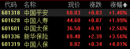 保险板块大涨,中国人保涨超4%,新华保险涨超3%,中国太保、中国平安涨超2%,中国人寿涨近2%。