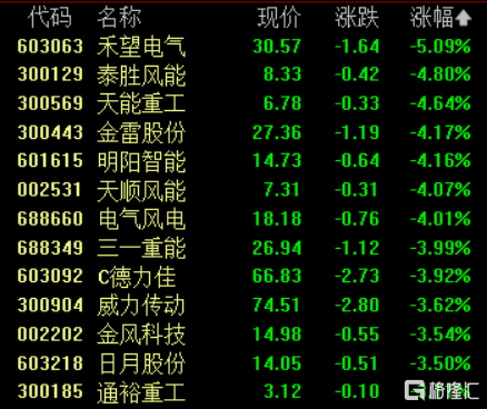 风电设备板块下跌,禾望电气跌超5%,泰胜风、天能重工、金雷股份等跌超4%。