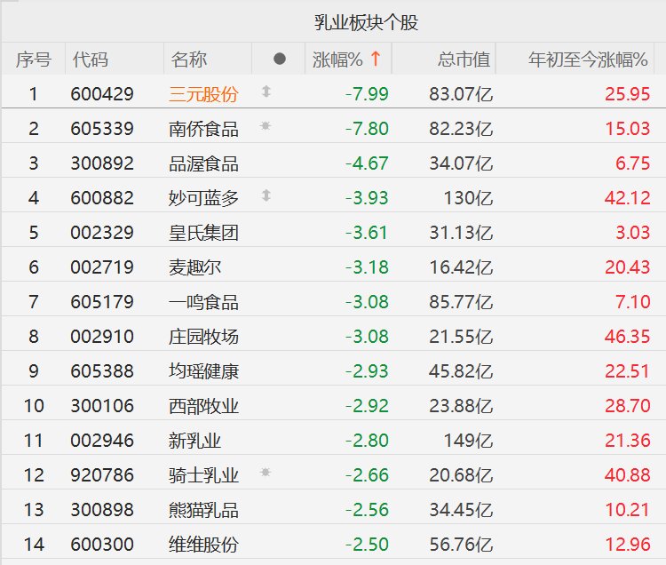 格隆汇11月20日|A股市场乳业股集体下跌,其中,三元股份、南侨食品跌超7%,品渥食品跌超4%,妙可蓝多、皇氏集团(维权)、麦趣尔、一鸣食品、庄园牧场跌超3%,均瑶健康、西部牧业、新乳业、骑士乳业、熊猫乳品、维维股份跌超2%。