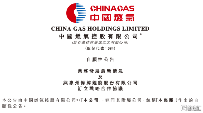 近期,中国燃气(0384.HK)发布自愿性公告,与惠州亿纬锂能(维权)股份有限公司(“亿纬锂能”)签订战略合作协议,建立全方位、深层次的战略合作伙伴关系,这一举措吸引资本市场和投资者的高度关注。