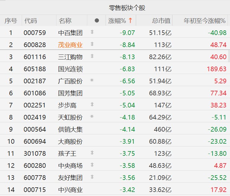 格隆汇12月11日|A股市场昨日表现强势的零售股今日集体回调,其中,中百集团(维权)跌9%,茂业商业、三江购物跌超8%,国光连锁、广百股份跌超6%,国芳集团、步步高(维权)跌超5%。
