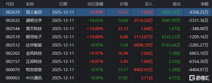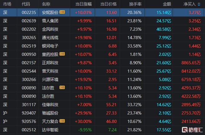 龙虎榜单日净买入额前三为雪人集团、金风科技、通光线缆,分别为3.25亿元、2.34亿元、1.73亿元。