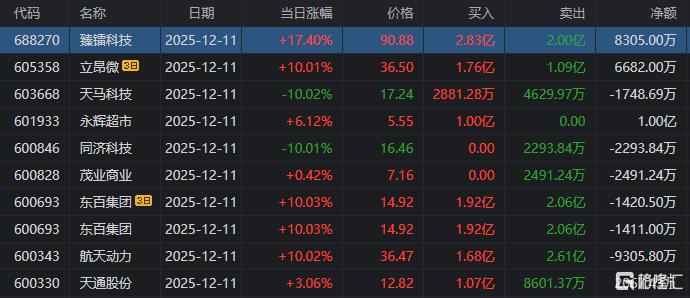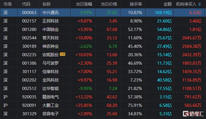 龙虎榜中涉及机构专用席位的个股中,单日净买入额前三为中兴通讯、正邦科技、中国铀业,分别为6.32亿元、3.46亿元、1.81亿元。