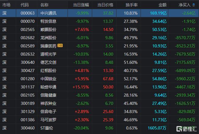 龙虎榜单日净卖出额前三为中兴通讯、特发信息(维权)、顺灏股份,分别为2.64亿元、1.91亿元、1.74亿元。